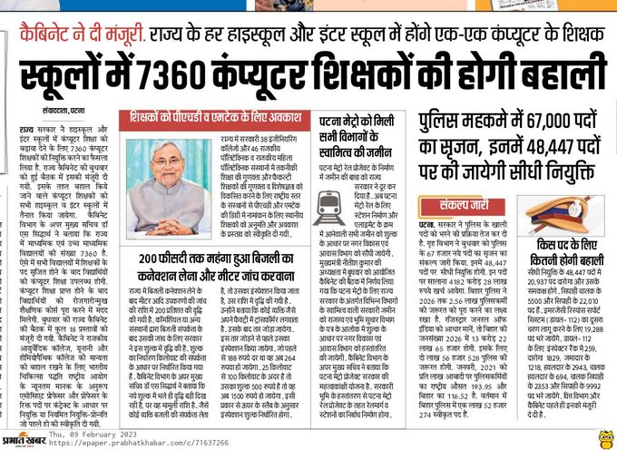 Bihar High School Computer Teacher Vacancy 2023- शिक्षा विभाग की ओर से न्यूज पेपर आधारित नोटिस जारी किया गया है। इस नोटिस में कहा गया है कि राज्य के सभी 9360 हाई और हायर सेकेंडरी स्कूलों में कंप्यूटर शिक्षक की बहाली जल्द होगी. बुधवार को मुख्यमंत्री नीतीश कुमार की अध्यक्षता में कैबिनेट की बैठक हुई, जिसमें इस भर्ती के लिए कंप्यूटर शिक्षक के 7360 पदों के सृजन को मंजूरी दी गई है. इस बैठक में 18 प्रस्तावों को मंजूरी दी गई है. प्रदेश के माध्यमिक एवं उच्च माध्यमिक विद्यालयों में विद्यार्थियों को कम्प्यूटर शिक्षा देकर रोजगार के लिए तैयार करने हेतु कम्प्यूटर शिक्षकों के पद सृजित किये गये हैं।